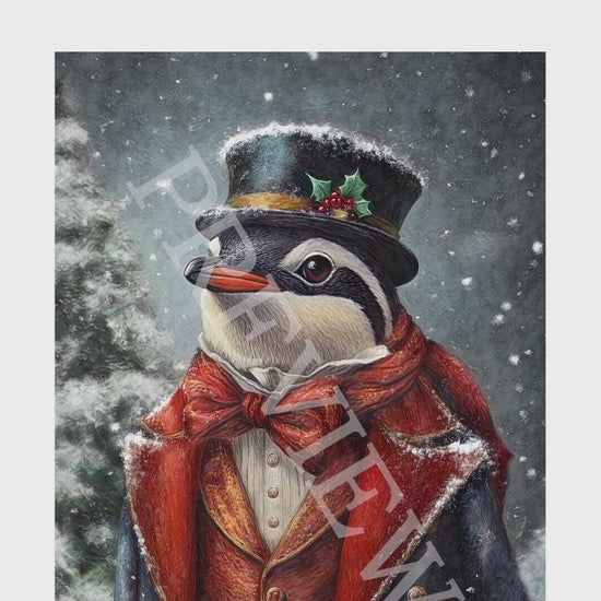 A gorgeous arctic penguin bird wearing a vintage style suit and top hat with festive details. Made in the style of a vintage painting. Part of our Winter animal collection.
