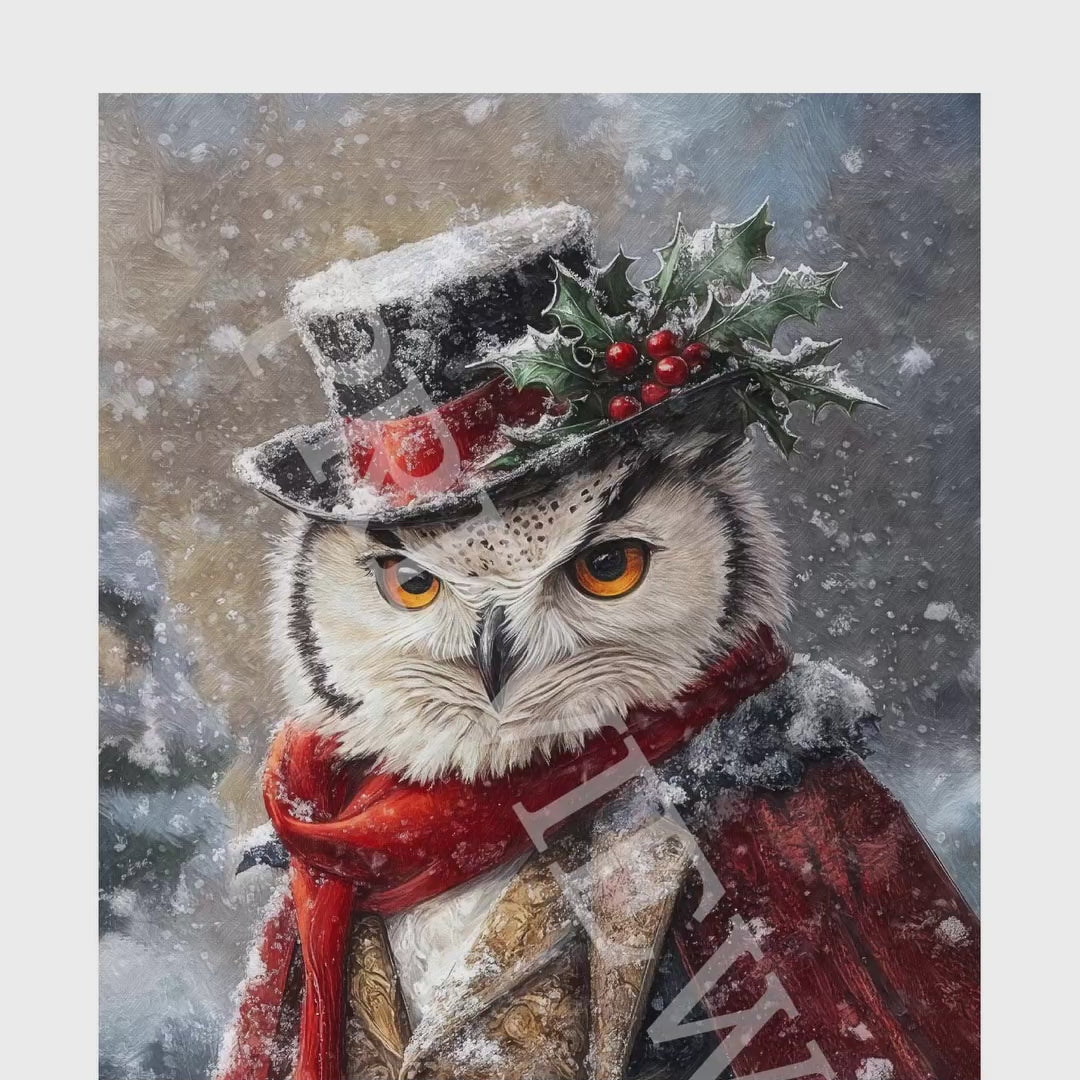 A gorgeous snowy owl bird wearing a vintage style suit and top hat with festive details. Made in the style of a vintage painting. Part of our Winter animal collection.